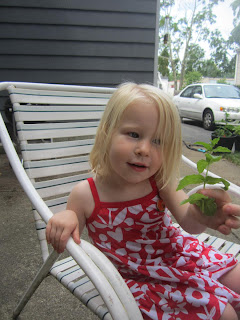 Then Friday, Nanny and Pop Pop came to town! Madeline checked out the vegetables growing in our garden when she wasn't helping me grill. She also found a worm -- "That's a nice worm. That's my friend worm." -- in the garden.