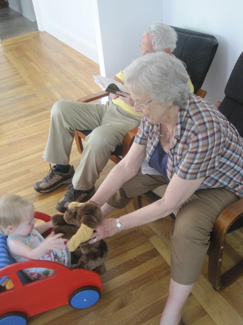 Finally, before bed Madeline brought many gifts to bestow on her great grandparents: a doggy, a football, a sea star, another ball, and a cow card.